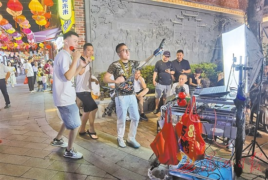 6月21日晚,3名年轻人在兴化府历史文化街区直播唱歌,青春韵律引发大家共鸣合唱。