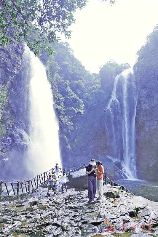 在九鲤湖景区,湖面波光粼粼,瀑布飞流直下,沿途奇石林立,游客徜徉其中,感受山水诗画美景。明代地理学家、旅行家、文学家徐霞客盛赞的“峻壁环锁,瀑流交映,集奇撮胜,唯此为最”瀑布点,更是人气爆棚。