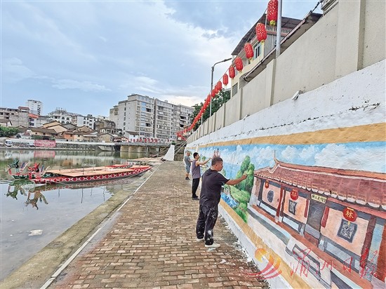 新时代广场对面,长达250余米的溪岸护堤墙已完成水泥漆磨平,画家们正赶制“九仙结枫为亭”“铁面御史林兰友”“洪忠洪延造桥”等主题大型壁画。枫江大桥下,兰友社区干部杨精扎正组织20多名志愿者制作彩架、清扫溪域、铺设人行步道。