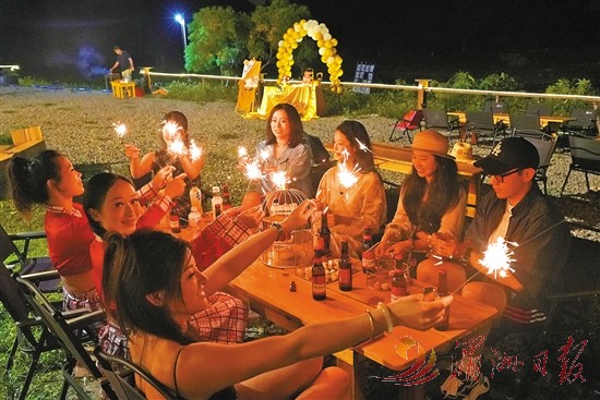 8月6日傍晚,萩芦镇深固大桥网红露营基地灯火璀璨,晚风轻拂,置身其间,可感受“天然氧吧”带来的舒适与惬意。市民在露营地围炉烧烤,尽享夏夜悠闲时光。“帐篷租赁+烧烤美食+赏景玩水”的消费链条,正推动深固村从传统村落转型为区域级夜间休闲聚集区。