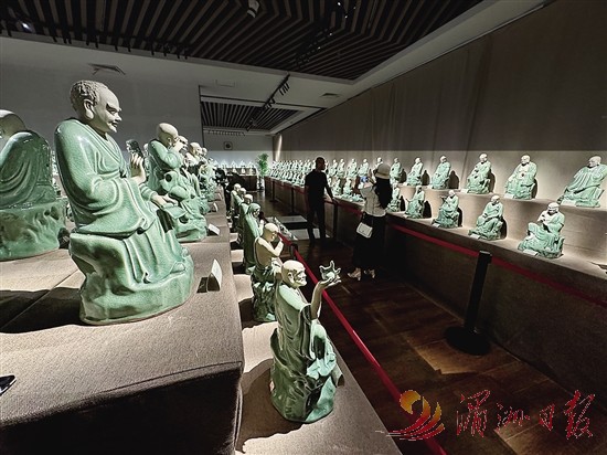 或怒目降魔,或低眉慈悲,或诙谐自在……《仙游青瓷五百罗汉》作品巧妙融合了莆仙地区人物造像的韵味与青瓷艺术的质朴之美,通过细腻的雕刻手法和生动的表情刻画,展现了罗汉的慈悲、智慧与威严,栩栩如生。