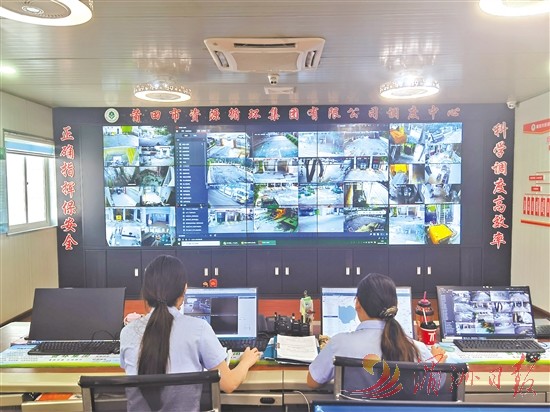 ▲台风天,莆田市资源循环集团调度中心值班人员通过公共视频实时关注各路段状况。