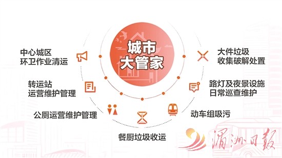 “城市大管家”管什么?该集团市场运营部负责人陈少华介绍,中心城区环卫作业清运、转运站运营维护管理、公厕运营维护管理、餐厨垃圾收运、大件垃圾收集破解处置、动车组吸污、路灯及夜景设施日常巡查维护都归这位“大管家”管理。