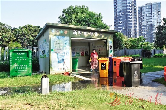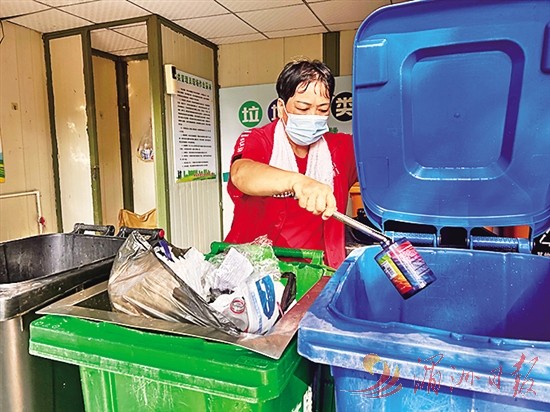 “货品”分拣后,还得保持“柜台”的整洁。每天清晨,绿色的清运车运走厨余垃圾,她会先把2个绿色的垃圾桶清理干净。