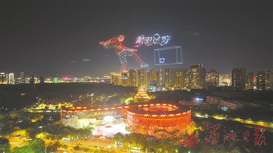 9月27日晚,市区绶溪公园举办无人机表演。图为夜空中,“莆田足好”的动感光影点燃群众激情,为“莆超”赛事加油助威。 全媒体记者 杨洲 摄