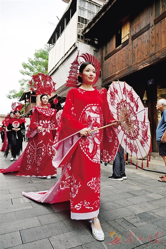 ▲昨日,兴化府历史文化街区,非遗剪纸服装巡游举行。