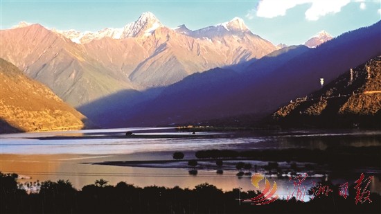 想来那位摄影师是在雅鲁藏布江对岸的玉松村,占了江滩拐弯的绝佳位置取景,金色的山峰倒映在碧蓝江水里,流光在波面上跳跃起舞。为了得见神山这一面,不知他在江边蹲候了多少个黄昏。