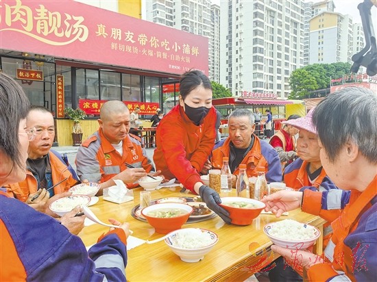 活动现场,爱心企业精心准备了招牌靓汤与特色菜肴,工作人员热情地为环卫工人添饭盛汤,欢声笑语间暖意融融(如图)。除了暖胃的午餐,企业还为每位环卫工人送上暖心礼品。环卫工人们捧着热饭、接过礼物,脸上洋溢着幸福的笑容。