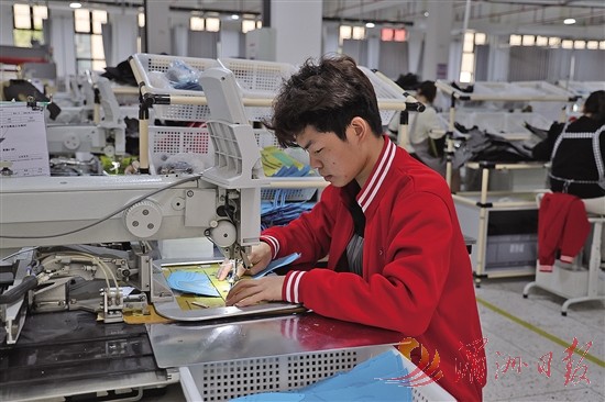 新协诚鞋业深度参与品牌方的研发、生产,构建起“新材料研发—高端生产—品牌输出”的完整链条。图为员工正在用电脑针车机器缝制鞋面。全媒体记者 林罗晓 摄