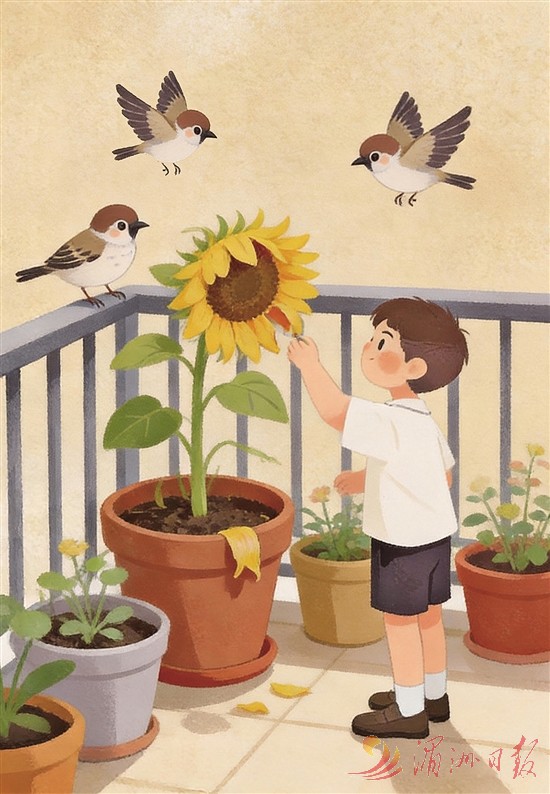 有一年春天,爷爷在阳台的花盆里撒下向日葵种子。没过多久,嫩绿的芽儿就冒了出来,一天天往上长,夏天时开出了金灿灿的花盘。花谢之后,沉甸甸的花盘里结满了饱满的瓜子。爷爷没有摘,而是笑着说:“留着吧,给鸟儿当口粮。”