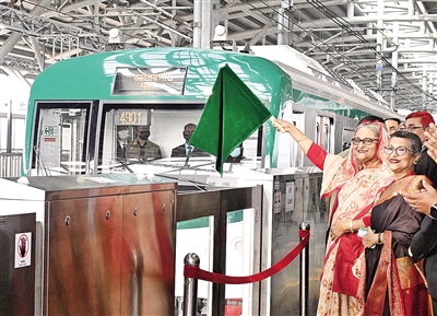 12月28日,在孟加拉国首都达卡,孟加拉国总理哈西娜(右二)出席该国首条轻轨开通仪式。 新华社 发