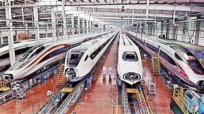 1月4日,动车组在车库内等候发运。春运在即,作为国内主要高铁动车生产企业,中车青岛四方机车车辆股份有限公司对即将服务春运的动车进行检修,确保动车以优良的状态投入到春运一线运营中。