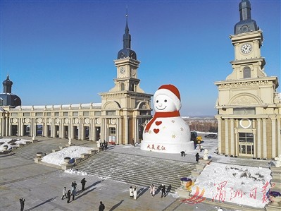 1月5日在松花江哈尔滨段江畔拍摄的大雪人。1月4日,经过工人十余天的忙碌,凭借“超治愈”的笑容,成为哈尔滨“网红”的大雪人,“回归”松花江畔。今年的大雪人用雪量约2000立方米,依旧18米高,憨态可掬。 新华社 发