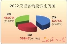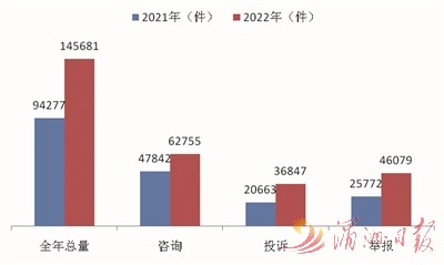 2022年,莆田市市场监管局通过12315平台共受理消费者咨询投诉举报145681件,同比增长54.52%。其中,接受消费者咨询62755件,同比增长31.17%;受理投诉36847件,同比增长78.32%,为消费者挽回经济损失1252.98万元;受理群众举报46079件,同比增长78.79%。