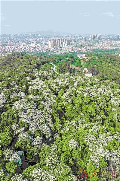 眼下,在我市不少山区,漫山遍野的油桐花竞相绽放,白色的花朵开满树梢,如“雪花”飞舞。图为昨日,新度镇下坂村壶公山上油桐花盛开,吸人眼球。全媒体记者 蔡昊 摄
