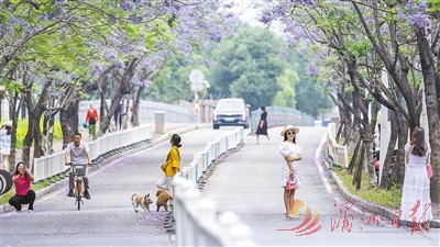 市区玉湖片区荔湖路两旁数十株蓝花楹盛开,吸引了许多市民前往打卡拍照。图为5月17日,正在紫色花丛下拍摄的游人。全媒体记者 蔡昊 摄