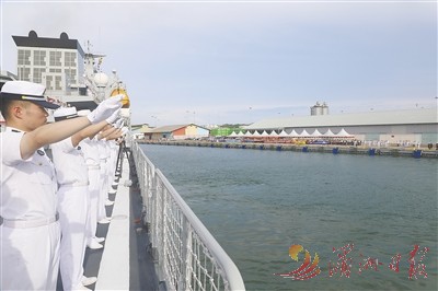 6月5日,在文莱摩拉港,中国海军官兵向码头上的欢迎人群挥手致意。执行远海远域实习访问任务的中国海军戚继光舰抵达文莱摩拉港,开始对文莱进行为期3天的友好访问。