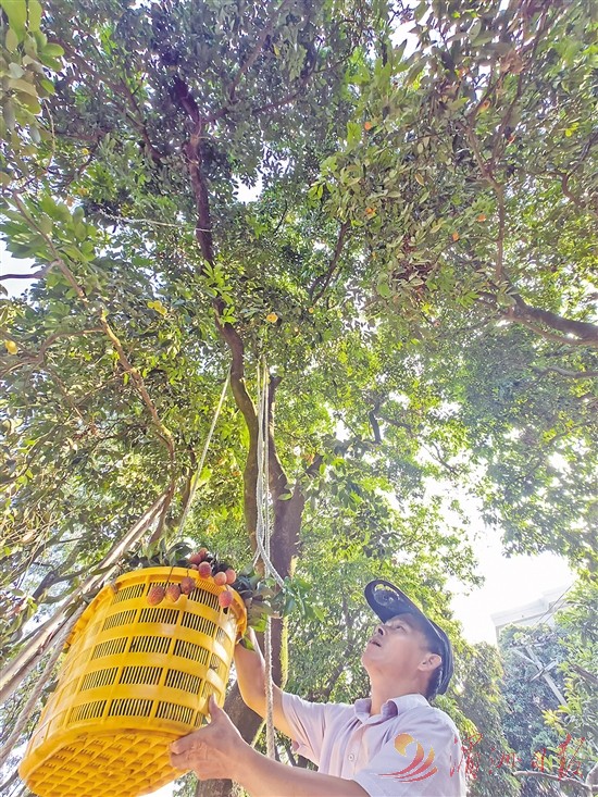 “老李啊,要小心小心!”荔枝种植园承包者黄明富站在树下,朝近20米高的树上喊道。他口中的“老李”,名叫李培成,今年71岁,泉州市永春人,因摘果出名,很多果场要提前预约才能雇请到他。记者看到,他身手敏捷,不一会儿就采摘了一箩筐荔枝,用绳子滑送下来(如图)。