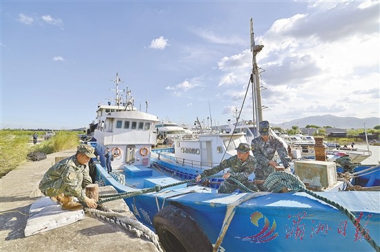 受台风“杜苏芮”影响,我市沿海风力加大。图为昨日,武警海警莆田大队队员在枫亭辉煌码头协助渔民加固渔船。全媒体记者 陈斌 摄