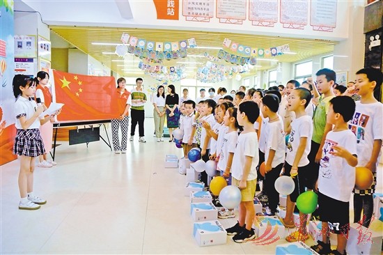 活动在东吴村“党建+”邻里中心举行,赛得利(福建)纤维有限公司负责人和学员代表先后上台发言,全体学员面向鲜红的国旗进行宣誓(如图),孩子们现场放飞气球,共同开启暑期公益夏令营。