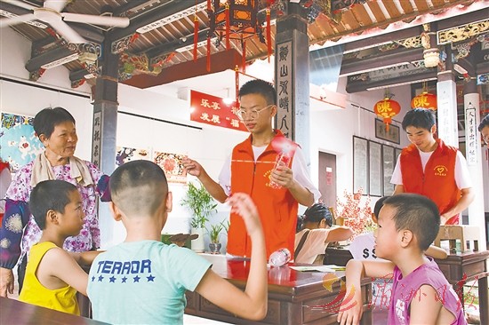 近日,莆田学院新工科产业学院“智”引乡村支教队前往东阳小学,举办环保主题活动。图为志愿者为小朋友们示范“变废为宝”。 吴衍权 李启泰 摄