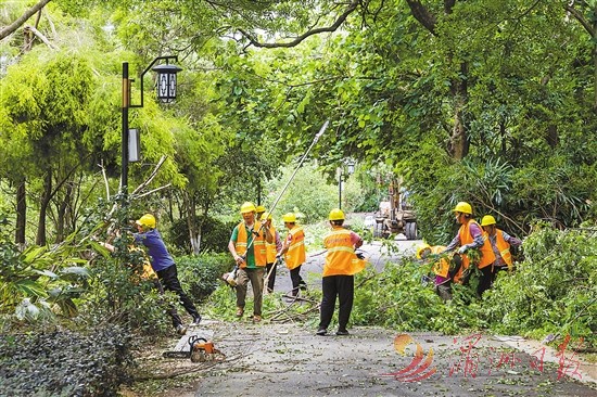 本报讯(全媒体记者 蔡蕊/文 陈斌/图)7月31日,记者在绶溪公园企溪段看到,12位工人分工协作,使用油锯对阻碍通行的低垂、倒伏树进行切割收运(如图),并对落叶进行清扫,确保路面干净整洁。
