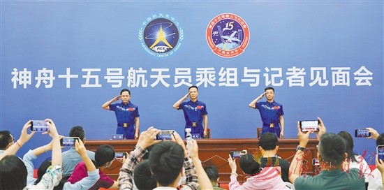 7月31日,航天员费俊龙(中)、邓清明(右)、张陆敬礼致意。当日下午,中国航天员科研训练中心在北京航天城举行神舟十五号航天员乘组与记者见面会。费俊龙、邓清明、张陆3名航天员从太空返回57天后首次正式公开亮相。新华社记者 郭中正 摄
