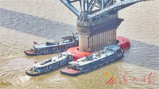 8月9日,中国铁路上海局集团有限公司工作人员对南京长江大桥桥墩防撞设施进行安装。8月10日,南京长江大桥3号、4号、5号桥墩顺利安装防撞设施并投入使用。 新华社记者 李雨泽 摄