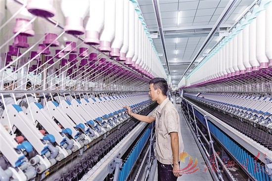 华源工贸是一家专注于高端混纺纱线的纺织企业,引进智能化、数控化纺纱生产设备,开发出功能性、差别化、环保型纤维混纺产品。图为昨日,企业全自动生产车间忙而有序。全媒体记者 陈斌 摄