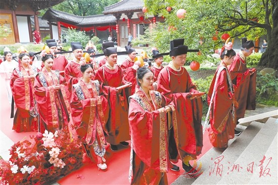 8月22日,8对新人身着婚庆礼服在福建省武夷山市参加武夷宫春秋馆举行的“朱子婚礼”。当日是七夕佳节,这一天是我国民间传说中牛郎织女鹊桥相会的日子,许多新人选择在这一天登记结婚。