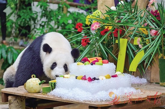 8月23日,在马来西亚吉隆坡附近的马来西亚国家动物园,大熊猫“靓靓”享用生日大餐。在马来西亚国家动物园大熊猫保护中心内,中国旅马大熊猫夫妇“兴兴”和“靓靓”23日迎来了17岁生日。 新华社 发