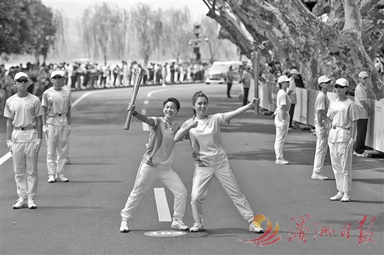 9月8日,火炬手王霜(左)与王沁鸥在火炬传递中。当日,杭州亚运会火炬传递在杭州西湖涌金公园广场启动,共有106棒火炬手参与当日传递。 新华社记者 黄宗治 摄