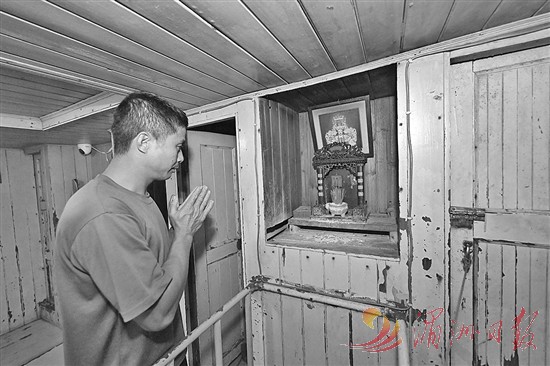 凌晨3时,湄洲岛宫下渔港里,一艘刚捕鱼回来的渔船上,渔民在船舱里向妈祖汇报收获情况,并祈求平安。 蔡昊 摄