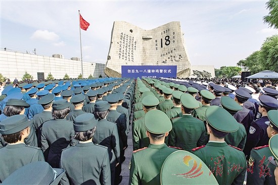 这是9月18日拍摄的勿忘“九一八”撞钟鸣警仪式现场。今年是“九一八”事变爆发92周年,9月18日上午,勿忘“九一八”撞钟鸣警仪式在沈阳“九一八”历史博物馆残历碑广场举行。 新华社 发