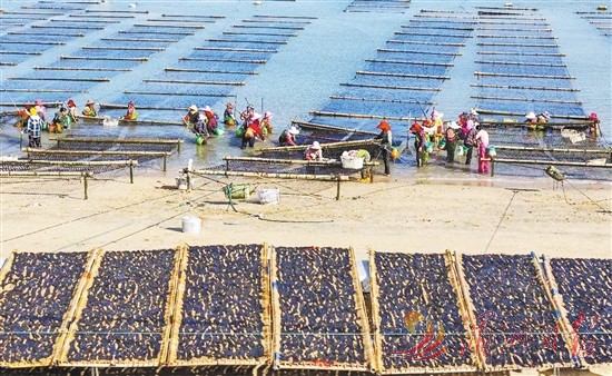 眼下,我市迎来紫菜采收旺季。图为在北岸山亭镇蒋山村,养殖户们忙着收晒紫菜。