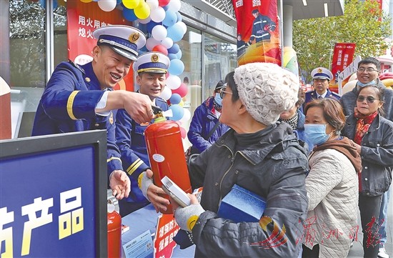 11月13日,消防宣传工作人员将现场展示的一支灭火器送给参观的市民。当日,上海市长宁区消防救援支队主办的2023年“119”消防宣传月启动展示活动在辖区内虹桥艺术中心举行。 新华社 发