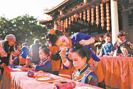 本报讯 (全媒体记者 陈沛达/文 陈斌/图)在第八届世界妈祖文化论坛举行之际,11月17日,第八届湄洲女发髻技艺展示活动在湄洲妈祖祖庙圣旨门广场举行。