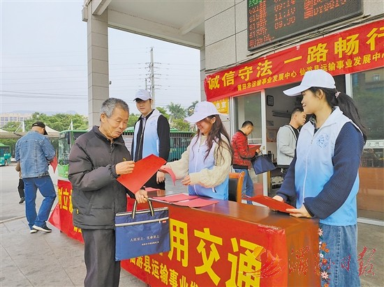 本报讯 (全媒体记者 戴立钦 通讯员 徐婷婷 文/图)为积极推进信用交通建设,推广诚信理念、弘扬诚信文化,11月24日上午,市运输事业发展中心联合仙游县运输事业发展中心,在仙游公交站举行倡导“诚信守法、一路畅行”宣传活动,推动交通运输信用体系建设高质量发展,营造行业诚信良好氛围(如图)。
