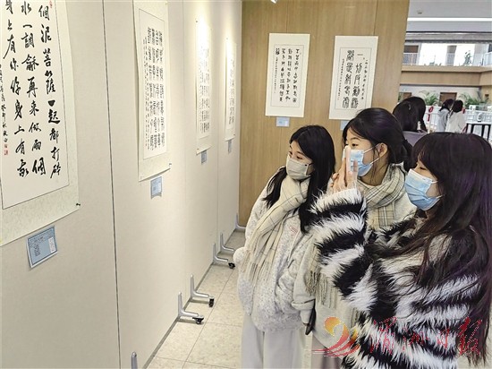 12月26日,以“缅怀伟人精神品格 推进青少年思想教育”为主题的纪念毛泽东诞辰130周年暨毛泽东诗词书法展览在湄洲湾职业技术学院举行。图为学生参观展览。