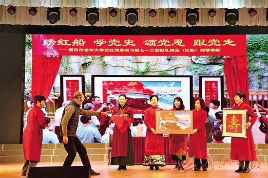 彭丽靖表示,女红班自创立以来,一直是在探索中成长,感谢老年大学这个平台、感谢女红班班委的有力坚持、感谢老师们的无私奉献、感谢学员们的鼎力支持,女红班的发展壮大充分体现了这个班级是有实力的,是有文化内涵的。本学期期末汇演的3个节目,多维度展示莆田女性的优雅、美丽、智慧和勤劳,是一种女红技艺的传承,更是一种对传统文化的尊重和弘扬。特别是情景剧《特殊的贺寿礼》(如图),是由女红班和市教师进修学校附属小学共同编排的创意表演形式,凝聚大家的力量和智慧,不仅体现了女红文化在下一代手中的传承,更体现了红船精神的代代绵延。
