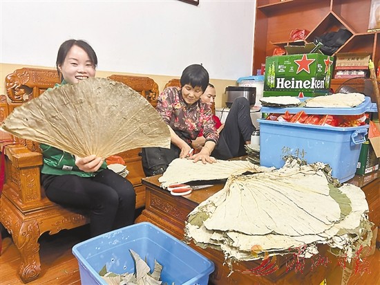 元宵期间,我市餐饮业生意火爆。图为涵江区白塘镇一农家饭店里,工作人员正在修剪荷叶,赶制食材。