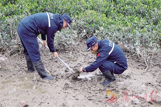 本报讯 连日来,莆田海警局荔城工作站执法员深入莆田市“蓝色海湾”整治行动项目(荔城区段)海域开展巡查工作,详细摸查木兰溪入海口红树林植被长势情况,及时清理滩涂垃圾,并补植红树林。