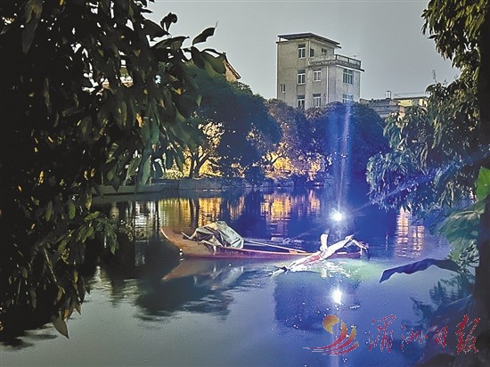 本报讯 (全媒体记者 蔡晨晖 文/图)4月16日晚8时许,白塘镇白塘湖支流水面上,一艘泛着微光的小渔船在夜色中引人注目(如图)。