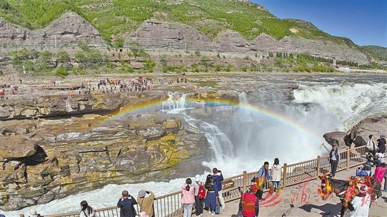 4月23日,游客在山西吉县黄河壶口瀑布观赏“清流飞瀑”景观(无人机照片)。近日,受上游降雨量较少和水库调节水量影响,黄河晋陕峡谷水流变缓,水色变清,壶口瀑布出现“清流飞瀑”景观。