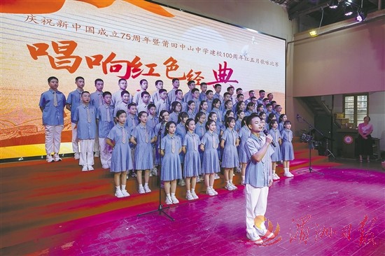 5月23日,为庆祝新中国成立75周年暨建校一百周年,中山中学举行红五月歌咏比赛,唱响红色经典。图为歌咏比赛现场。全媒体记者 陈斌 摄