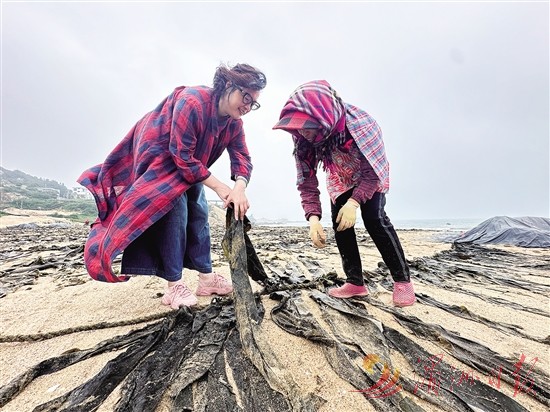 眼下,正值海带收获季。午后,我们前往福鲍沙滩,探访“海带晒场”。