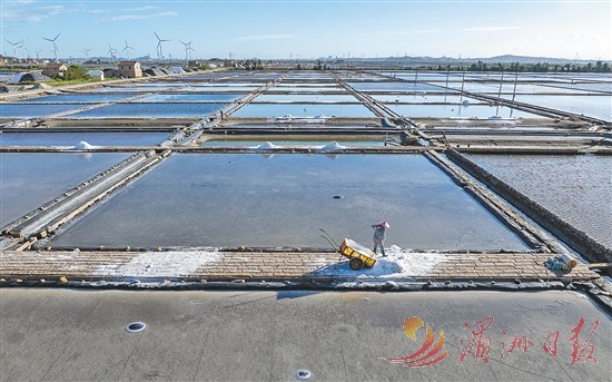 连日来,莆田盐场进入海盐收获季,工人们抓紧利用高温晴好的天气收获海盐,色彩斑斓的盐田里呈现一派忙碌的景象。全媒体记者 陈斌 摄
