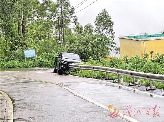 9月23日下午,大江线萩芦镇梅洋村路段,一辆小汽车行驶中,不慎撞上路边护栏,护栏纵向贯通车体。连日来,我市持续降雨,路面湿滑,市民行车务必降速、控距,平稳驾驶。全媒体记者 刘永福 摄