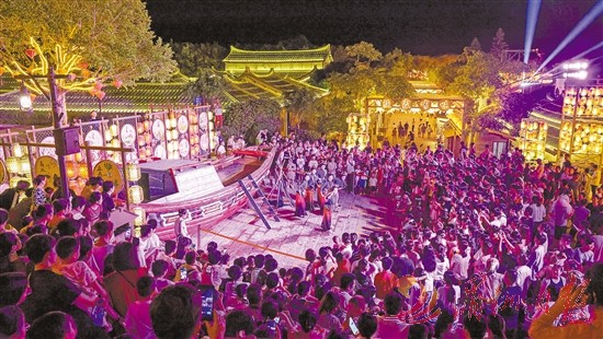 夜幕降临,湄洲岛妈祖影视城景区内流光溢彩,全国首部妈祖文化主题大型文旅项目《缘起湄洲》精彩上演。气势恢宏的仿古建筑群里,一个个实景复古演艺精彩绝伦,让游客仿佛置身于历史长河,“入景”体验渔村古堡风情,感受妈祖文化。