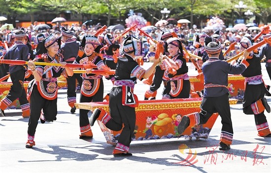 10月23日,演员在天等县霜降节开幕活动中展示壮族打榔舞。当下,广西崇左市天等县迎来晚稻收获期,到处是一派丰收景象。每年霜降时节,恰逢广西多地晚稻收获之季,人们在此期间举办传统的霜降节,欢聚一堂庆祝丰收。新华社记者 金皓原 摄